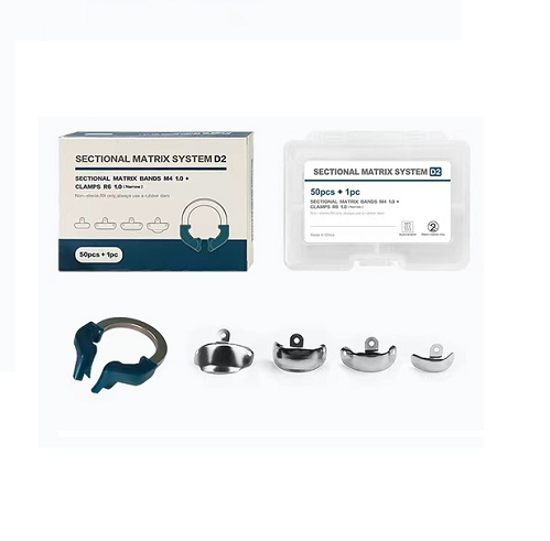 1 pc of NITI clamp with dark blue tips, 50 pcs of New sectional matrix bands with holes, M4 type