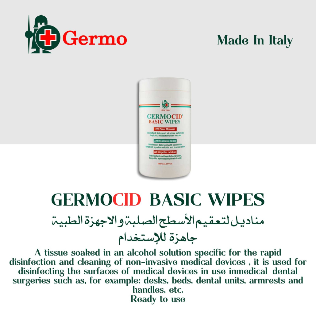 GERMOCID BASIC WIPES 220 is a tissue soaked in a specific alcoholic solution for the rapid disinfection and cleansing of non invasive medical devices used in medical, dental and beauty centers, such as desks, beds, dental units, armrests and handles, etc. also acting in presence of organic material (blood, saliva, organic exudates, etc.).