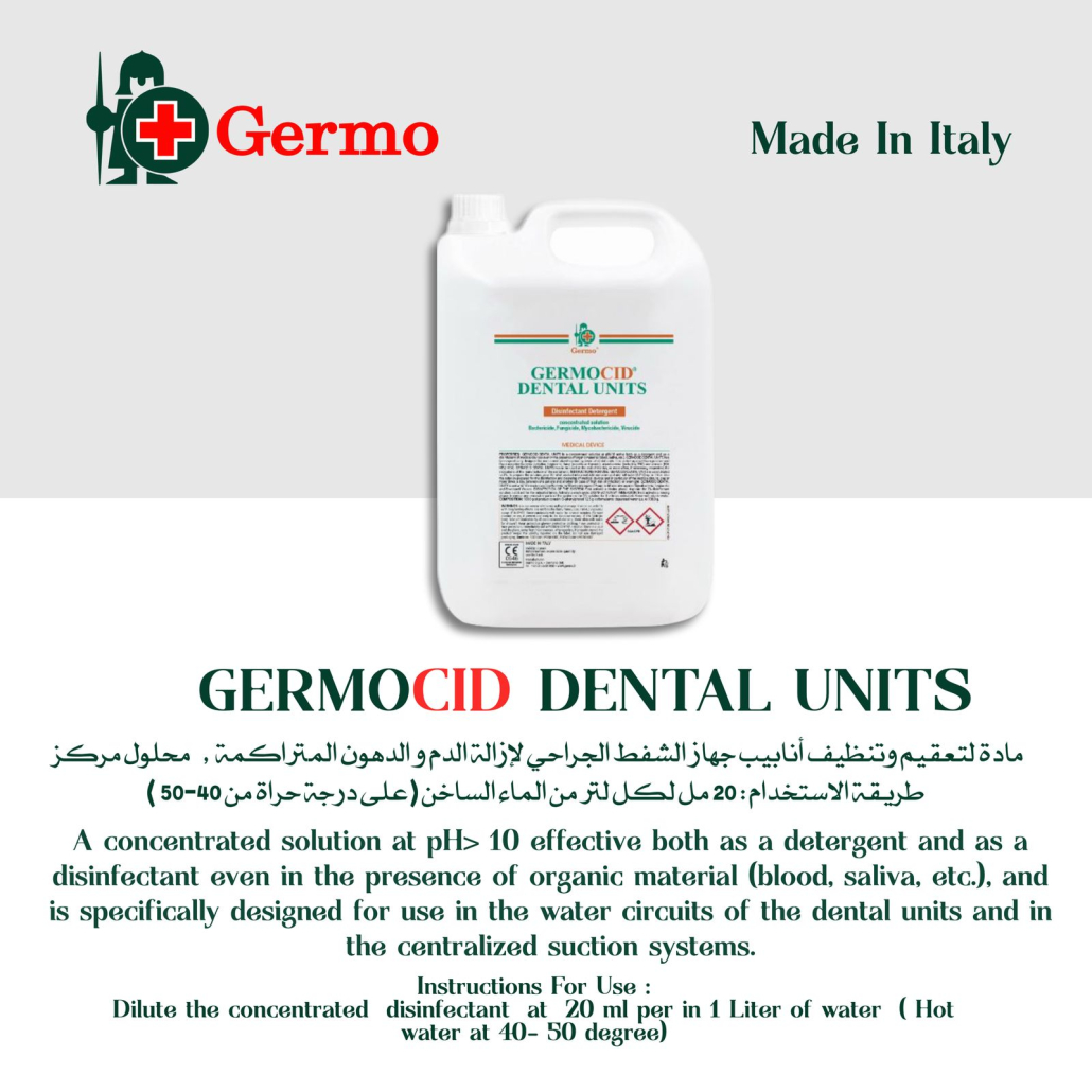 GERMOCID DENTAL UNITS is used diluted to 2%. To prepare the solution, pour 20 ml of product into a suitable